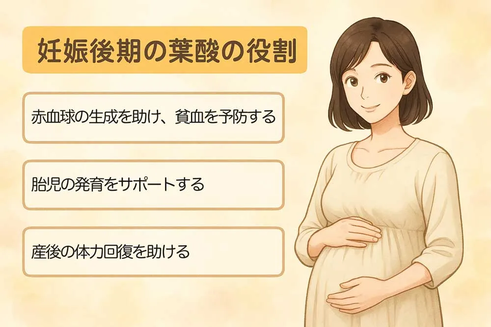妊娠後期(28週以降)も葉酸は重要な栄養素であり、貧血予防・胎児の成長・産後の回復に役立つため、適量を継続して摂取することが推奨されます。