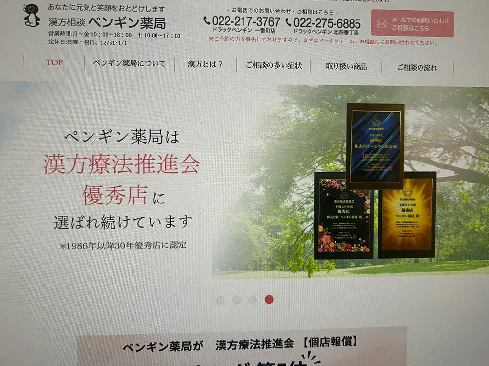 仙台市中心部・一番町に位置する「ペンギン薬局」は、女性向けの体質改善やダイエット漢方に力を入れている薬局です。薬剤師による丁寧なカウンセリングを通じて、自分に合った漢方を処方してもらえるため、無理なく継続できると好評。アクセスも良好で、通いやすさもポイントです。冷えやむくみが気になる方、自己流ダイエットに限界を感じている方におすすめです。