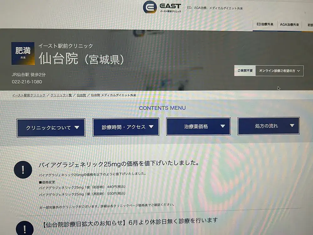 | イースト駅前クリニック仙台院 | 宮城県仙台市青葉区中央一丁目7番18号 | 9:30 ~ 13:30 / 14:30 ~ 18:30 | 不定休 |